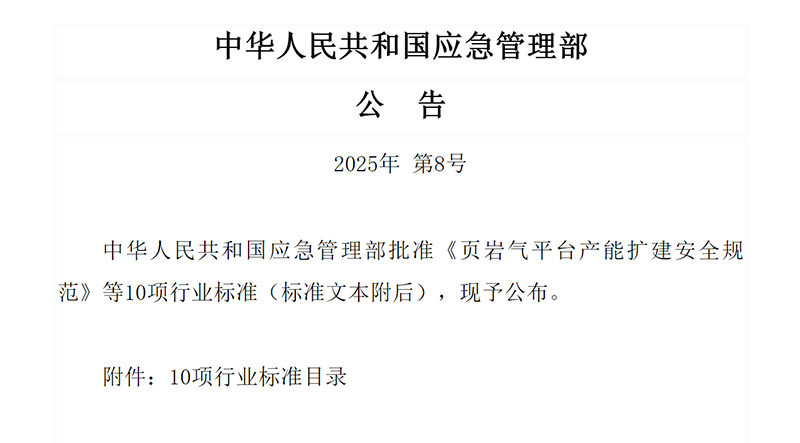 中华人民共和国应急管理部 公 告 2025年 第8号 中华人民共和国应急管理部批准《页岩气平台产能扩建安全规范》等10项行业标准(标准文本附后),现予公布。 附件:10项行业标准目录 应急管理...