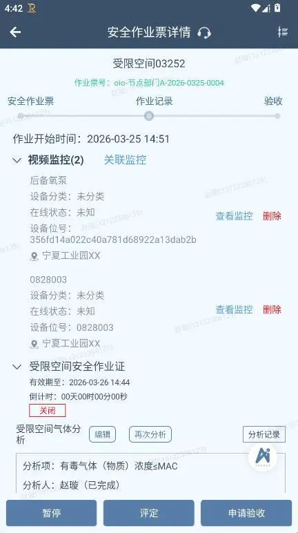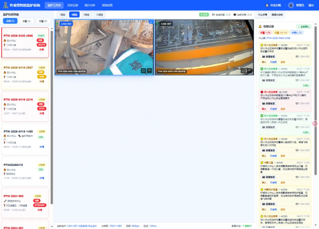 5. 差异化重点监护,适配各类特殊作业:针对受限空间、动火、高处、吊装等不同类型的特殊作业,系统可预设差异化监护重点,精准匹配各类作业的风险特点,避免“一刀切”管控,实现“一类作业、一套标准、精准防控”。