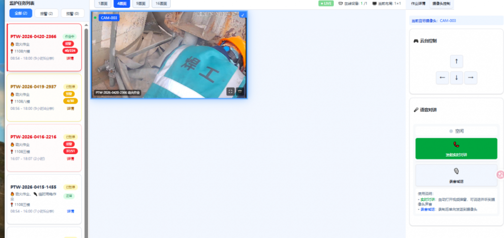 语音交互+云台控制,远程精准管控:支持语音播报、双向对讲功能,监护人员可通过监控中心远程向现场作业人员下达操作指令、提醒违章行为,现场人员也可实时反馈作业进展及现场情况,实现“远程指挥、实时联动”;云台可灵活旋转、变焦,精准捕捉作业细节,确保无监护死角。
